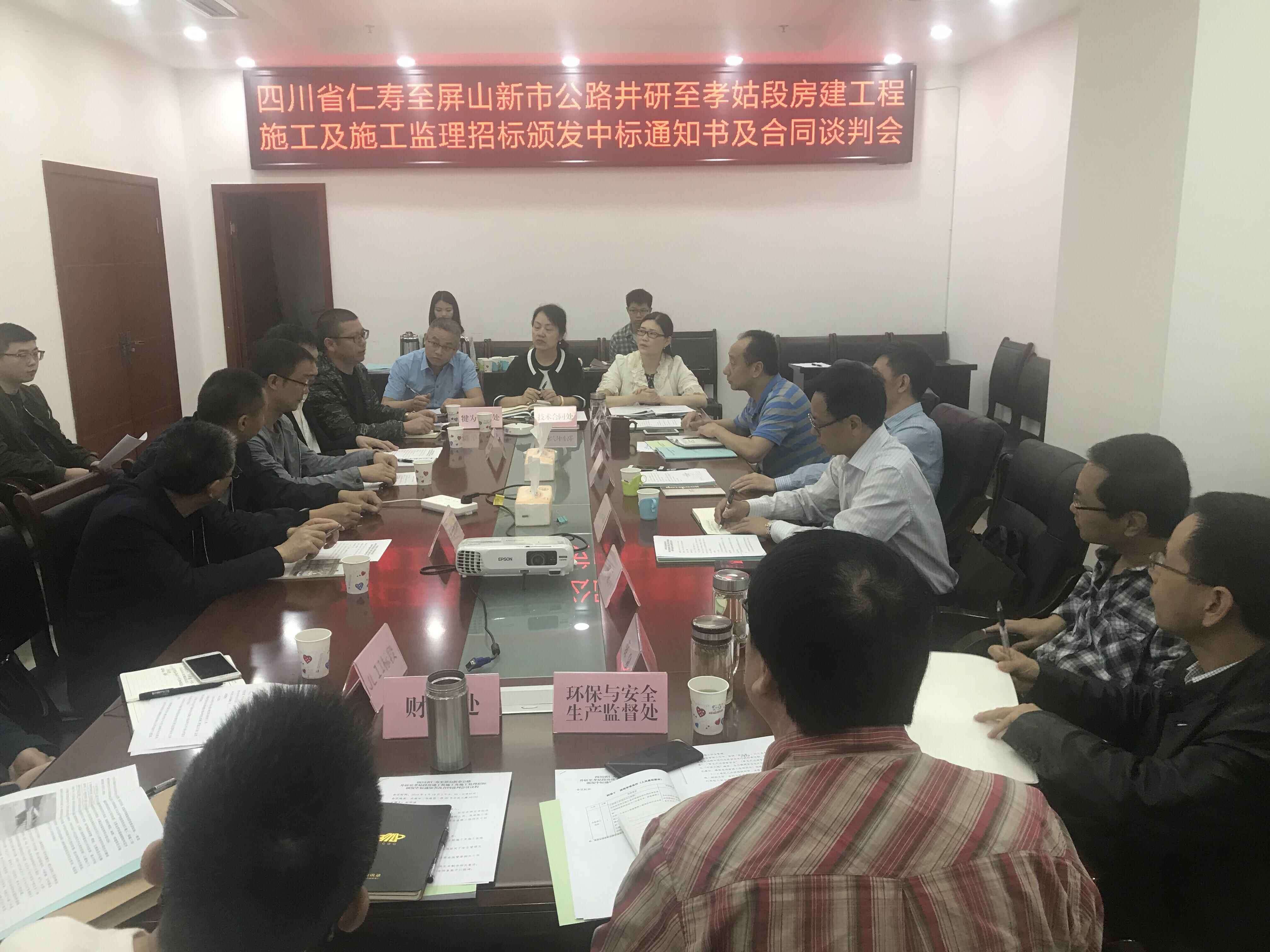 2019年4月19日上午9:30,仁沐公司在交投大厦A0102会议室组织召开了仁寿至屏山新市公路井研至孝姑段房建工程施工及施工监理合同谈判会,仁沐公司董事长刘勇、总经理姜杰明、副总经理向可明、纪检专员陈延昌、财务总监袁泉及各职能部门负责人、FJ4~FJ5标段、JL11标段中标人法定代表人及相关人员参加了本次会议。