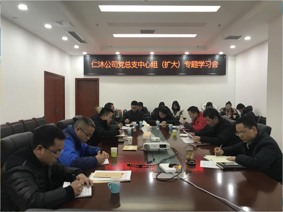 2019年1月4日上午,仁沐公司党总支书记刘勇主持召开党总支第8次中心组(扩大)学习会,党总支委员各部门负责人参加会议,专门对《省委领导批示通知》进行了传达,并由党总支书记刘勇、党委委员赵明雄、袁泉分别领学了习近平总书记关于坚定文化自信的重要思想、关于推进马克思主义中国化时代化大众化的重要思想、关于学哲学用哲学的重要思想。